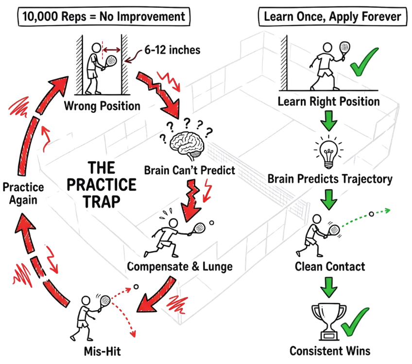 Because most coaching gives you temporary tips with no systematic progression, and YouTube creates information overload with contradictory advice. The Padel Performance Protocol™ fixes the ROOT problem—your positioning is off by inches, which makes your brain unable to predict ball trajectory accurately. When you learn the exact geometric setup positions, execution becomes automatic. You're not practicing harder—you're creating the optimal spatial conditions where your body WANTS to execute cleanly. That's why it works when fragmented advice fails.